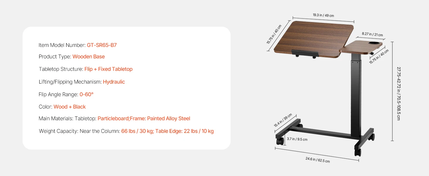 Adjustable Height: With a smooth hydraulic system, this overbed table adjusts from 27.75 in / 70.5 cm to 42.72 in / 108.5 cm — ideal for sitting and standing. Plus, the tabletop tilts 0-60°, making it ideal for reading, working, or drawing.